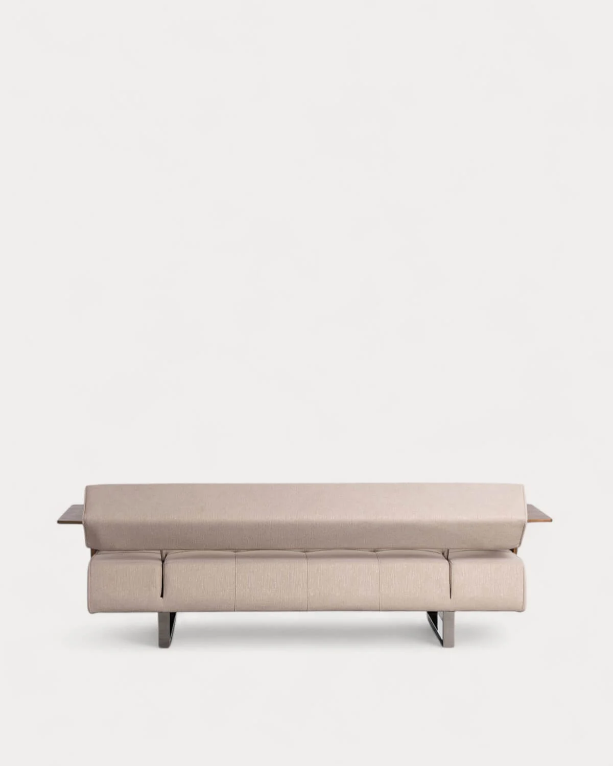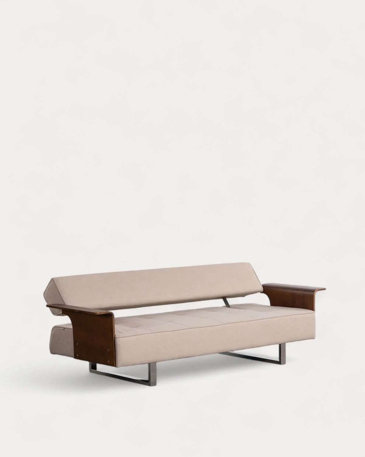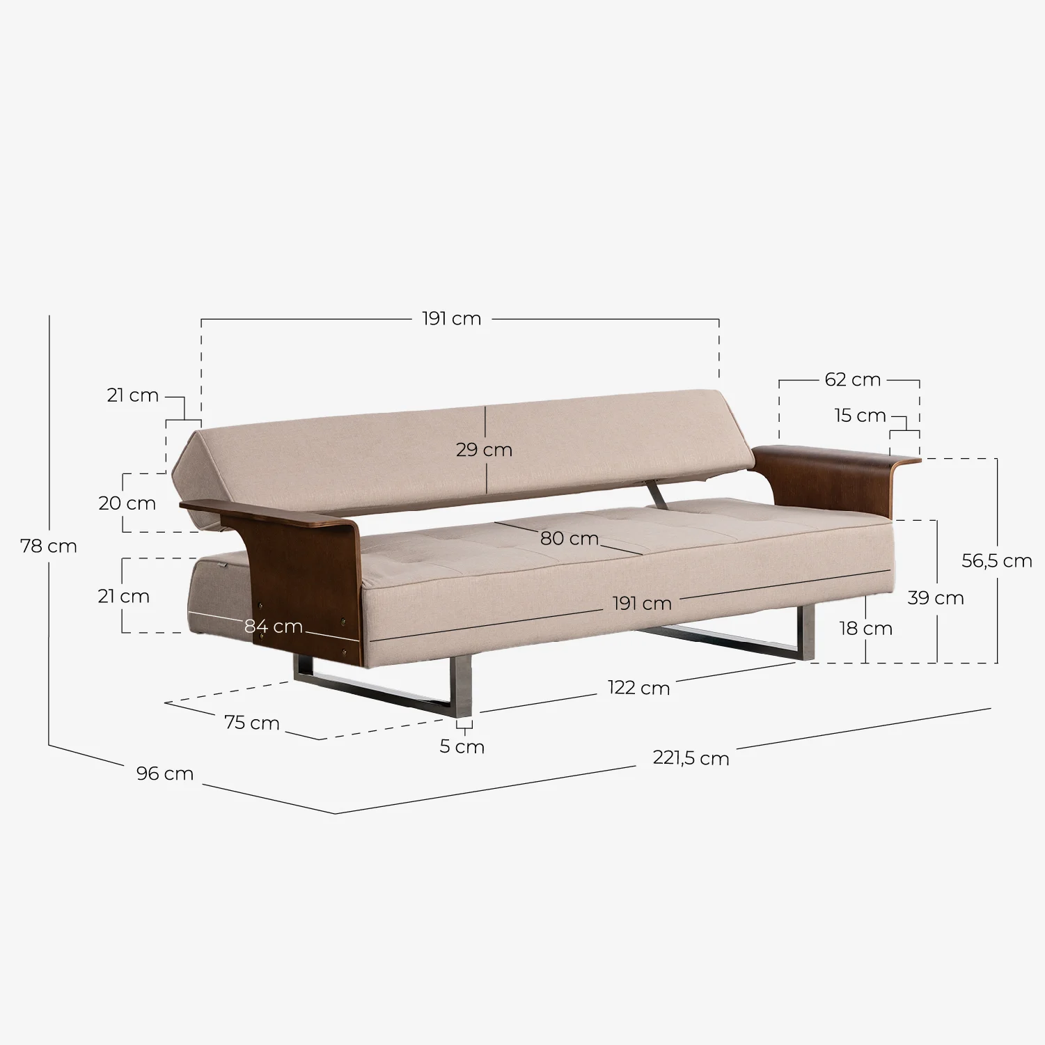 3-ადგილიანი გასაშლელი დივანი ქსოვილის და ხის სახელურებით