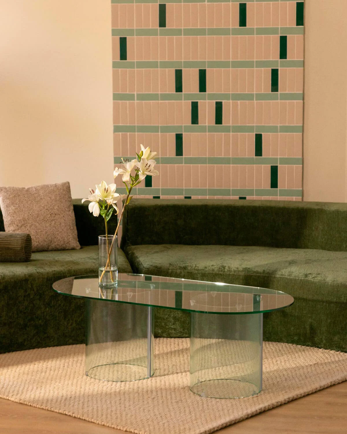 ოვალური ნაწრთობი მინის ყავის მაგიდა